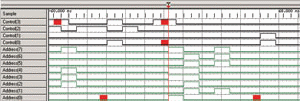 现在来查找问题的来源。使用逻辑分析仪的时序信号波形显示总线的各个信号线,并标记毛刺发生的位置。在图3中,逻辑分析仪已将控制总线扩展为四个单独的信号,并将地址总线扩展为八个单独的信号。图3中总线波形上的红色毛刺标记,现在显示为信号线Control(3)和Control(0)上的毛刺标记,以及信号线Address(0)上的两处毛刺。
