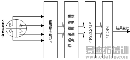信号通过放大和调理后由由A/D转换器(本系统中采用ADS7864)采样转换成数字量送入单片机,由单片机处理后得到目标的方位,并根据实际系统的需要输出方位控制指令。