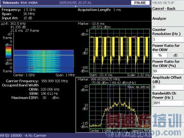 政府规定要求控制发射信号的功率、频率、带宽。这些规定防止有害干扰并保证每个发射者都是频带内其他用户的友好邻居。对于许多频谱分析仪特别是通常用于脉冲信号能量测量的扫频频谱分析仪,进行此类测量是具有挑战性的。RTSA 能够分析一个完整的分组发射过程的能量特点,也能直接测量跳频信号的载波频率,而无需将信号置于一个跨度的中心。按一下按键,分析仪就能识别一个瞬时 RFID 信号的调制方式并能够对功率、频率和带宽进行监管测量,使预一致性(pre-compliance)测试过程变得非常灵活和方便 [参阅图2]。预一致性测试有助于确保产品一次通过一致性测试,而无需重新设计和重新测试。