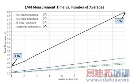 对于处理器密集型的物理层测量来说,选择不同的处理器对总体的测量时间影响很大。在图7至9中,可以看到传统仪器和PXI仪器在测量时间和平均次数之间的关系。