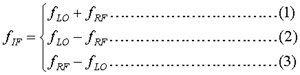 RF信号与LO信号经过混波器之后,产生许多两者之间频率倍数相加减的信号。当输入信号与本地振荡器经过混频之后,会产生三种中频的可能(或者更多),可用以下公式来求出所要的正确中频信号: