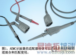 用户可以使用另外的适配器,它带有一个连接电缆的BNC插座(图1)。我用其中一个将函数发生器连接到该示波器上。另一个适配器提供了DMM探头的香蕉头。这是很方便的,因为这样就可以混用和匹配使用各个通道,从而将示波器探头、DMM连线或其他附件(如电流探头)连接到任何通道。评估的全部示波器都有两个示波器通道和一个DMM通道。