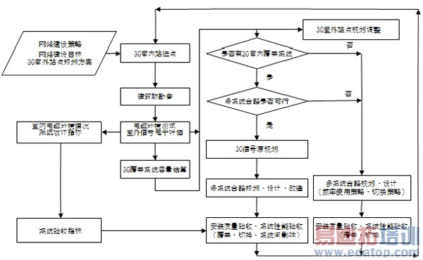 电信业重组已经拉开序幕,移动运营商必须通过提供优质的网络服务,才能吸引更多的用户,在激烈的竞争中拔得头筹。由于用户使用习惯的改变,当今社会移动业务绝大部分发生在室内,根据DoCoMo 的3G 运营经验,69.7%的话务量来自室内,只有约30.3%的话务量来自室外,室内覆盖的好坏直接影响整个网络的质量,因此各大运营商都高度关注室内网络的好坏,同时也在室内网站建设中投入巨资。为了使网络能平稳的过渡到3G,使得室内覆盖系统能在最短的时间之内满足3G 的网络服务质量的 要求,更好的为用户服务,运营商进行了室内覆盖系统的网络改造和升级。通常的3G 室内覆盖系统的改造流程如下: