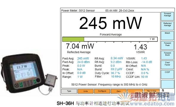 SignalHawk 系列产品目前包含SH-36S手持式频谱仪和SH-361S 手持式单端口矢量网络分析仪频谱仪;SignalHawk 拥有精确,强大及丰富的功能使得现场的工作变得更简单,更轻松。单端口矢量网络分析仪(VNA)可用于VSWR 和回波损耗测试,以及故障点定位测试(DTF )和馈线损耗测试;SignalHawk 还可与Models5012,5010B,5011 和5011-EF 等功率传感器相连接使用。这些功率传感器提供了±5% (±0.2 dB)的正向功率精度,同时还可以用来测量反向功率,驻波比(VSWR), 回波损耗(dB),峰值功率,突发平均功率,峰均比和CCDF。CCDF 测试用CDMA 系统来说是一个极为关键的指标,可以用于评估放大器和各种器件的特性。