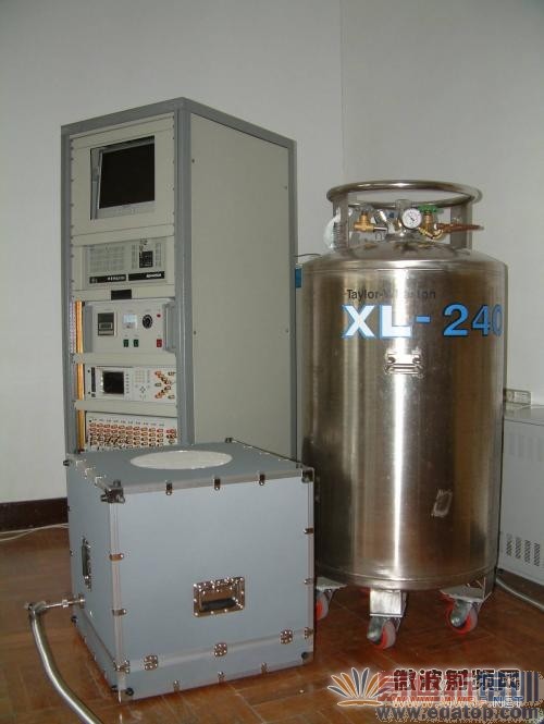 立式机柜所包含的仪器设备从上到下分别为工控机显示器、工控机机箱、温度控制机箱、FLUKE1590超级电阻测温仪、FLUKE2590多路扫描开关。图片前方灰色箱体上表面的白色泡沫塑料窗口为变温源的亮温辐射口面。泡沫塑料在这里的用途主要是绝热和防止水汽遇冷而凝结在辐射体表面。