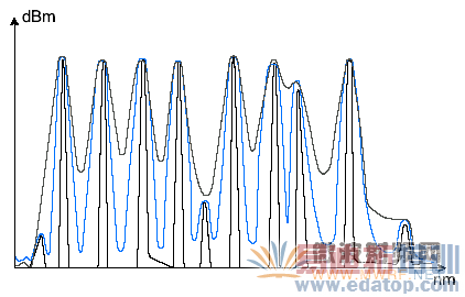 图3是两个由同一个信号测得的光谱曲线对比。上面的曲线由光抑制比较差的光谱分析仪测得,下面的曲线则由光抑制比较好的光谱分析仪测得。如果多个通道相隔很近(如50GHz),好的光抑制比的重要性就更加显而易见。