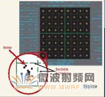 图6为连续噪声干扰。这主要来源于系统内的调制产物,外面的强烈干扰,如计算机,广播发射信号等,这些干扰信号是连续的,它使得星座图的每个点成中心空的小园圈图形,严重者形成一个个小园环。