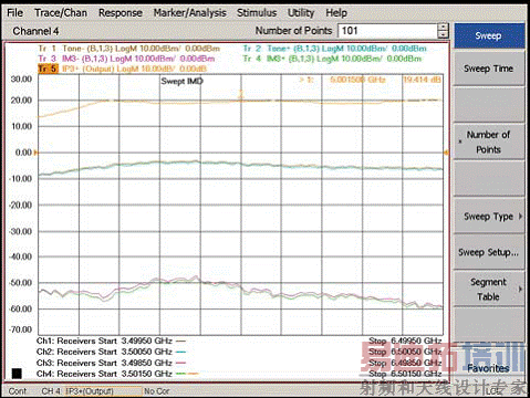 图4示出一个用PNA-X完成的扫描IMD测量实例。两条居中迹线显示激励信号,下方两条迹线显示IMD分量。最上方的迹线则是利用了PNA-X特别有优势的公式编辑特征计算并显示的三阶截获点(IP3)。