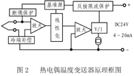 热电偶温度变送器一般由基准源、冷端补偿、放大单元、线性化处理、V/I转换、断偶处理、反接保护、限流保护等电路单元组成。它是将热电偶产生的热电势经冷端补偿放大后,再由线性电路消除热电势与温度的非线性误差,最后放大转换为4~20mA电流输出信号。为防止热电偶测量中由于电偶断丝而使控温失效造成事故,变送器中还设有断电保护电路。当热电偶断丝或接触不良时,变送器会输出最大值(28mA)以使仪表切断电源。热电偶温度变送器的原理图如图2所示。