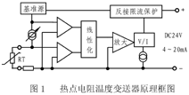 一体化温度变送器一般由测温探头(热电偶或热电阻传感器)和两线制固体电子单元组成。采用固体模块形式将测温探头直接安装在接线盒内,从而形成一体化的变送器。一体化温度变送器一般分为热电阻和热电偶型两种类型。热电阻温度变送器的原理如图1所示。