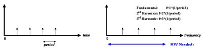 图2. 时域中的周期信号以间隔为信号周期的一串脉冲表示。这在频域中相当于以(1/周期)的积分求解值发生的一串脉冲。