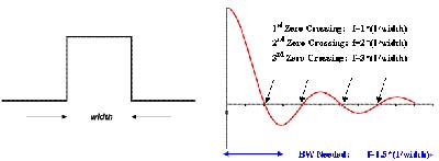 图3. 时域中的脉冲变换成频域中的sinc函数。经验法则是系统需要足够的带宽,捕获第二个sinc包络的一半。
