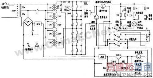 一生产单位提出能否为其设计制作一台简单实用的可控硅测试仪,用于产前筛选,在了解其常规测试项目和参数后,按附图所示电路制作了一台测试仪,经用户使用后反映测试方法简便实用,测试结果准确。