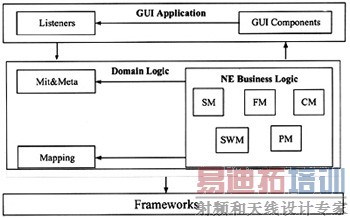 根据业务实现NE Simulato在纵向上可分为3个部分:GUI APPLICATION,Domain Logic,Framework。