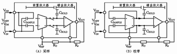 电路通过电子开关来切换两个阶段循环工作:在时钟上半周期,电路处于采样阶段,采样电容器CSAMPLE连接到信号输入端,该输入信号的差分电压VDIFF被存储在CSAMPLE上,共模电压被抑制。在此期间,增益放大器与前置放大器断开,以使其输出保持在以前采样的输入信号幅度;在时钟下半周期,电路处于动态校零和放大阶段,CSAMPLE上采集的差分信号被提供给增益放大器,刷新存储在CHOLD上的电压值,并由增益放大器放大。当CSAMPLE连接到前置放大器的输出端时,前置放大器的共模输出电压被下拉到参考电位VREF。用这种方法,使CSAMPLE与前置放大器具有相同的共模电压。