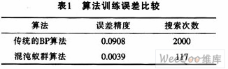 学习网络的隐含层节点个数经多次训练后确定为k1=11和k2=6,设n为输入节点个数。混沌变量个数m为神经网络所有权值、阈值的总和,m=156,蚁群种群数M=30,p=0.8,Q=50。其算法训练误差比较如表1所列。