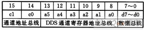 信号产生和调理输出部分的作用是通过接收控制命令对各通道的DDS电路进行控制。经过FIFO缓冲的16位来自用户的控制命令FIFO_DATA,由数据控制部分识别、解析、校验后传输到数据串/并转换模块,串/并转换模块按照数据格式的要求将其转换为2位通道地址总线部分(c1,c0)、6位DDS寄存器地址总线部分(d5~d0)和8位数据总线部分(d7~d0),组成16位控制字,如下所示: