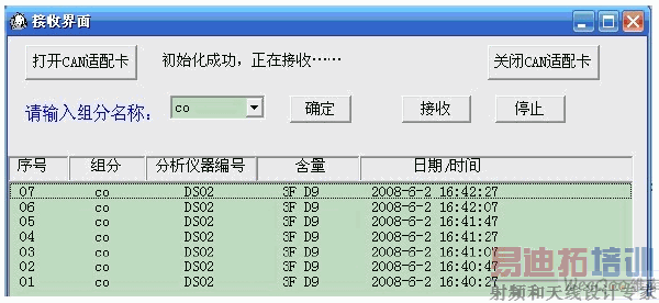 使用 KPCI-8110 的测试程序向分析仪器周期发送一帧数据时,查看测试程序和分析仪器存储器可以看出,分析仪器端正确地接收到PC 发送来的数据,CAN 网络运行良好。图5为自己开发的接收界面试验状态下成功接收到数据,分析仪器网络分析周期为20s,发送速率为100Kbps。