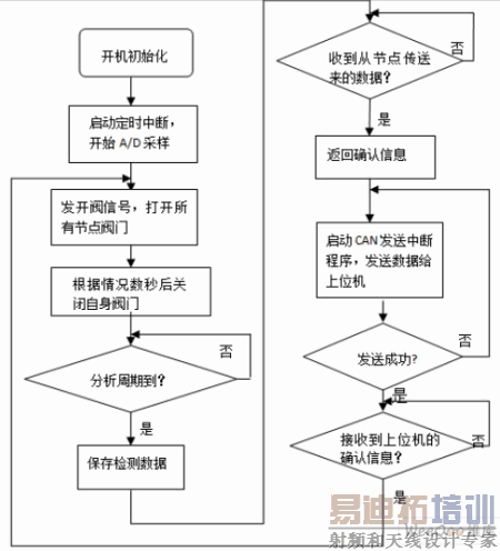智能节点分析仪器端的编程采用 C 语言与汇编语言相结合的方式,采用结构化程序设计方案,可读可移植性好。流程如图3 和4 所示。