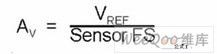其中VREF代表ADC的参考电压,"Sensor FS"是传感器的满刻度输出值。假设电阻完美匹配,那么仪表放大器的增益等于: