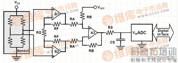 传感器的满刻度输出即最大输入,能够在放大器输入端看到。当传感器输出处于满刻度时,ADC输入应该接近其满刻度值,这个值通常就是ADC的参考电压VREF。放大器要求的增益大小为: