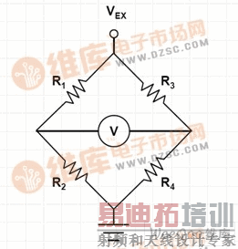 图1:受激励电压VEX和差分输出电压V驱动的惠斯顿桥。