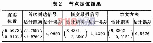 假设有三个参考节点(0,0)、(10,0)、(10,10),盲节点到参考节点的实际距离分别为6.20、2.88、9.46,利用三边测量法可以获得节点的位置,如表2所列。