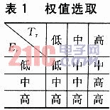 这里使用模糊逻辑技术来选取权值a。设首次到达信号和幅度最强信号的幅度分别为Ef和Es,并定义E=|Ef|/|Es|,Tr=(Tf-T0)/(Ts-T0)。Er和Tr为模糊逻辑函数的输入,a为输出。Er、Tr和a分别定义了低、中、高3个值。选择a值的规则如表1所列。