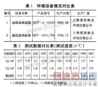 现以使用我单位的传感器测试没备对压力传感器的测试为例:在其他测试条件相同的情况下,使用两台不同的环境设备分别对10台未补偿的压力传感器进行零点温度测试。两台烘箱的参数指标见表1,传感器的测试数据见表2。