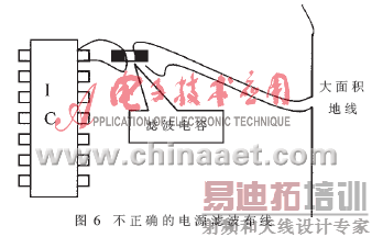 在电源入口处,应当接入一个几十微法的钽电解电容和一个0.1μF的独石电容。数字电路部分的电源滤波一般只需在数字IC的电源端用一只0.1μF或0.01μF的独石电容进行旁路滤波。该电容必须尽量靠近数字IC的电源引脚处,并且接地端要直接接入大面积的地线,否则收效甚微(见图6)。模拟电路" title="模拟电路">模拟电路 的5V电源应当和数字电路的5V电源分开走线,中间用磁珠加以隔离,以消除数字电路引起的电源波动对模拟电路的影响。DAC电路的运放要同时进行高频和低频滤波,即在各运放的正负电源端同时采用数微法的钽电解和0.1μF的独石电容进行旁路。如果使用开关电源,则运放的正负12V电源都要用磁珠串联以减轻开关噪声对输出信号的影响。