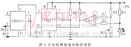 D1、电压比较器LM311、延时电路和触发器组成。光电管用来检测沥青试样下坠状态,发光源和光电管分别放在烧杯的前后两面。当沥青试样受热下坠达25.4mm时,沥青试样正好遮住发光源射入到光电管的光线,这时光电管两端呈高阻状态,光电管D1的阴极电位升高,电压比较器LM311反相输入端的电位高于同相输入端的电位,比较器的输出端输出低电位。该低电位输入到由LM555组成的延时电路并从延时电路输出。而且,电压比较器LM311和延时电路LM555两部分还组成整形电路。把CD4013双D触发器的引脚3、5接地,CD4013便接成基本RS触发器。LM555的3脚输出的信号送到CD4013的6脚,触发CD4013的一个D触发器使CD4013的2脚输出信号送到单片机的外部中断INT1端。一般情况下,检测装置设计两个沥青试样同时检测。图3是一路沥青试样的检测电路" title="检测电路">检测电路
