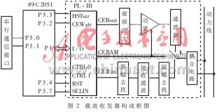 载波收发器构成框图如图2所示。为了上层协议和应用的需要,采用单片机89C2051作为载波收发器的主处理器,完成对PL-III的控制并与上位机或下位机的通信。