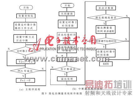 系统要正常工作,需有软件的配合。系统软件除了完成系统的硬件初始化外,还要完成对硬件电路的实时控制,对数据进行输入输出操作和数值的分析,并根据数据分析的结果作相应的处理。由于本系统被设计成PC ISA卡的个人仪器形式,简化了测量系统的结构,并能充分利用PC机的运算资源,大大提高测速上限。简要测试程序框图如图5所示。