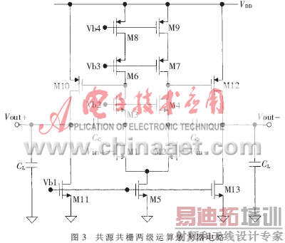 由于在第一级中采用了共源共栅(cascode)结构,极大地提高了第一级的输出阻抗,具有较高的增益。其直流增益可表示为: