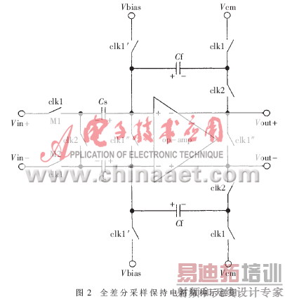根据时钟,该电路的工作可分为采样和保持两个阶段。在采样阶段,时钟clk1、clk1′和clk1″有效,运算放大器的两个输入端被短路,电容CS对输入信号进行采样并以电荷的形式存储起来。在保持阶段,clk2有效,存储于CS上的电荷转移到电容Cf上,从而实现了对采样电压的保持。由于采用了全差分结构、相应的时钟控制以及底极板采样技术,可以有效地降低开关沟道电荷注入、时钟馈通、共模电压、温度漂移等的影响,提高了电路的精度。此外为了减小由输入采样开关M1、M2的非线性导通电阻引入的非线性,还采用了栅压自举电压控制的NMOS采样开关以改进采样开关的线性度,提高精度及输入信号的范围。