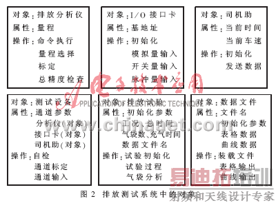 抽象数据类型是面向对象程序设计的中心概念之一,一个面向对象软件系统的结构框架及高层设计最终表现为一系列类、它们的定义和对象。类是一个抽象的数据类型,它的定义包括一组属性数据和在属性数据上的一组操作,通过类的界面对外提供服务,对象是类的实例,对应于问题域中的实体。面向对象分析过程标识问题域中的实体,确定这些实体之间的关系,这一阶段产生描述系统功能和问题域基本特征的综合文档。汽车排放测试系统中的对象如图2所示。