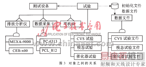排放测试系统的硬件设备可能选用不同类型的分析仪,如HORIBA公司的MEXA_9000或AVL公司的CEB_x00,也可能选用不同类型的I/O接口卡,如中泰公司的PC_6313或研华公司的PCL_812,根据用户的要求也可能增加新的试验项目。在面向对象方法中,继承是使用现存类作为基础建立新类的技术,新类复用现存类的定义,并且可增加新的属性及操作。对象间通过消息进行通讯,消息是对操作的实际调用,其中“发送者”向“接收者”发送一个消息,以实现某些处理功能。排放测试系统中对象之间的关系如图3所示。