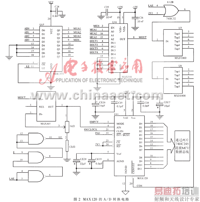 MAX308的一路被选通的同时, LAE信号还与写信号2Y2进行逻辑组合作为A/D转换器MAX120的启动信号。考虑到被选中通道的模拟信号出现在MAX308输出端需要一定的建立时间才能达到合适精度,同时工作在方式1下的MAX120其内部采样保持器也需要一定的采样时间(350纳秒)来捕捉输入模拟信号,因此在MAX308的通道切换和启动MAX120之间需要一定的时间间隔才能保证转换结果的精度。为此设计中选择了使LAE与2Y2信号相或,再通过两片MXD1000延迟芯片延时400纳秒作为A/D 转换器的启动信号CON。转换启动后,MCU通过与PA0管脚相连的
