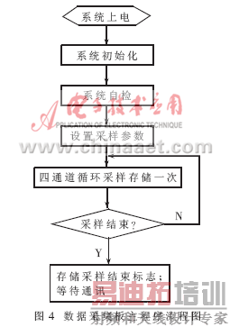 数据采集板软件主要实现两个功能:完成对模拟量的采样和存储;与PC机联机通讯。主程序流程如图4所示。在设置采样参数后,数据采集板对4路模拟信号进行一次循环采样,存储结束后根据采样结束标志判断是否已完成数据采集工作。其中采样结束标志是在主模块判断触发后、数据采集板中的外中断(IRQ)响应时,执行中断子程序时设置的。在采集过程中,程序把采集到的数据连续存储,每当所设地址指针到达数据存储区底部时,设定其重新指向存储区顶部,用重新存储的数据刷新原来的数据。采样结束后在数据存储器区最后一次的采样数据之后存储连续$0F个$FF,作为采样结束的标志。数据传输到地面PC机之后,在数据处理中可根据连续的$0F个$FF标志向前判断、选取所采集到的各个通道碰撞波形。这种循环存储方式在有限的存储空间内最大长度地保存了所需要的碰撞时刻前后的波形。