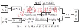由相关函数的性质可知,两个完全相同的信号相关度最大,从红外传感器来的两路信号仅相差一个时间延迟。向某一方向将数据移位并做相关运算后,记录移位的个数,当移位到两组数据的对应点相同时,相关度最大。通过这一最大的相关值对应的移位个数,即可求出渡越时间τ0。因而,设法对信号进行移位比较、找出其相关值最大时的移动间隔成为该系统信息处理的关键。为此,我们采用图4所示的信号处理方法来寻找渡越时间。上、下游信号经过放大器后,进行二值化处理,并将结果分别存于存储器1和存储器2中,然后连续改变延时地址。延时地址每改变一次,将下游数据和上游数据移位后对应的数据做一次异或非运算,并用计数器累加运算结果,逐个移位找出计数器的最大值,再通过移位的个数求出采样间隔N。设采样的时钟周期为T,则渡越时间为: