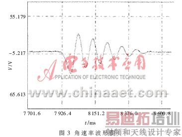数据采集系统的主要功能是采集陀螺仪输出的角速率信号。本文主要研究陀螺仪作小角度往复振动过程中的测量问题。为了便于分析数据,数据采集从陀螺仪静止开始,直到完成振动过程并回到初始状态结束。采集完成后,利用上位机对数据进行分析、处理,并进行波形显示,如图3所示,横坐标表示时间,单位为毫秒,纵坐标表示陀螺输出的角速率信号对应的电压值,单位为伏。