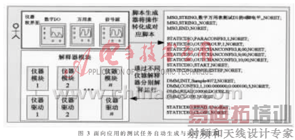 测试任务的自动生成首先建立在被测设备的全面分析的基础之上,通过分析理清被测设备输入和待测信号的关系,根据测试任务需求,用户在信号对应的仪器模块的软件界面上直接操作仪器,比如使用数字IO配置信号通道,使用射频信号源发送射频信号,使用射频分析仪进行频谱分析。在对应软面板操作结束后,其仪器模块中的解释器将完成对操作记录的转化,生成相应的操作脚本。在一系列操作能满足测试需求后,整个测试过程将被以脚本的形式记录保存。在需要重现某一测试任务的测试过程时,仪器操作脚本可以被脚本执行层统一调度后解释执行,通过预定义的交互接口,调用程序能方便快捷地得到测试返回结果。图3给出该技术的基本原理。
