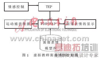 在虚拟教学环境中,虚拟教师的面部表情携带着教师的一种教学情感(鼓励、平静、赞许、批评、惊奇等),它作为虚拟教学活动的一种重要辅助手段支持教学活动的展开和知识的传递。目前,常用的表情识别方法有:基于几何特征的识别方法、基于代数特征的识别方法、基于连接机制的识别方法、频率域特征识别、基于隐马尔科夫模型的识别方法以及基于运动特征的识别方法等[15]。在表情控制方面,采用基于MPEG-4的人脸动画参数,即用于描述特定脸型的人脸定义参数(FDP)和描述脸部活动的人脸动画参数(FAP)。首先对教师教学活动典型表情特征进行分析,提取教学情感特征参数TEP(Teaching Emotion Parameter),然后根据虚拟教师的情感控制模块将TEP映射到FDP和FAP。另外,建立适应于教学情感状态的虚拟教师面部表情模型,在FAP的驱动下,使虚拟教师发生相应的面部表情变化,实时表现虚拟教师的面部表情。虚拟教师面部表情控制如图1所示。