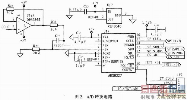 数据采集主要负责模数转换和信号采集,将各种需要测量的模拟量通过.A/D转换后送到DSP。其中测量通道和参考通道的信号由红外探测器产生,由一个A/D转换器转换,转换精度为16 bit,根据要求选择可直接与TMS320F2812接口的串行16 bit A/D转换器;其他参与气体浓度补偿计算的信号,包括湿度、温度和大气压力信号由TMS320F2812自带的A/D分时转换,转换精度为12 bit。以上信号转换后送到DSP处理器缓存。经系列复杂计算处理最终得到被测气体的浓度值。这里给出用于测量通道和参考通道信号采集的电路设计,如图2所示。