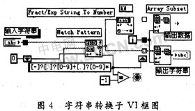 SN TRAN子程序功能:字符串转换子程序,读取含有以逗号、换行或其他非数字字符分隔的数字ASCII字符串,并将其转换为一个数组,采用该子程序可以将Multisim 10中采集的数据转换成LabVIEW中可以读取的数据,其程序框图如图4所示。