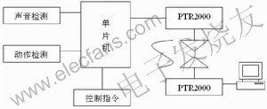 本系统中采用基于RF芯片nRF401的无线数传PTR2000模块。nRF401是NORDIC公司最新推出的单片无线收发一体的芯片,包括高频发射、高频接收、PLL合成、FSK调制、FSK解调及多频道切换等部件,是目前集成度最高的一种无线数传芯片。PTR2000既可与80C51、89C2051、68HC08、PIC等各种单片机的串口或I/O口直接连接,也可通过电平转换芯片MAX232与PC机进行串口通信。