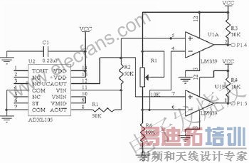 由于ADXL105可直接输出模拟信号,因此只需要通过比较器将ADXL105的输出电压与阈值电压相比较,当加速度大于某一阈值时输出高电平。其原理电路如图3所示。LM339的OUT3脚输出运动检测信号,接单片机的P1.4口;OUT4脚输出运动自检信号,接单片机的P1.5口。