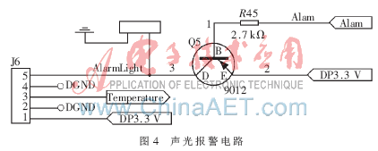 若测爆装置测出混合气体有爆炸危险,则蜂鸣器鸣叫,同时红色指示灯闪烁报警。DSP的GPIOB09输出端控制Alarm,当有爆炸危险时,输出低电平,三极管Q5导通,蜂鸣器报警,同时AlarmLight控制的报警指示灯点亮。其电路如图4所示。