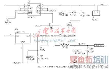 通过公式VOUT=VREF(R1+R2)/R1计算输出电压,其中VREF为1.2 V,R1为MAX603的输出端和可调端间加的电阻,R2为可调端和地间的电阻。通过合理配置R32、R31阻值即可得到+6 V电压。另外,利用ICL7660S和AMS1117产生-5 V、3.3 V电压。