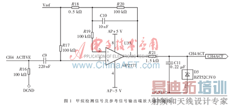 仅以甲烷检测部分为例,甲烷红外传感器IR12BD包括气体检测信号及参考信号两个正弦脉动信号,输出信号小,且夹杂干扰信号,所以需要对该信号进行处理,以得到精确的检测信号。甲烷红外传感器放大滤波电路如图1所示[2]。